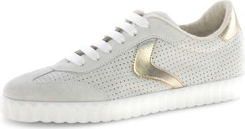 Supple suede frames the airy side panels of this lightweight sneaker set on a corrugated rubber sole.