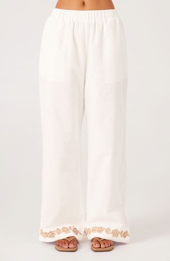 A swirl of soutache adds sweet style points to summery staple pants cut from a cool blend of linen and cotton.