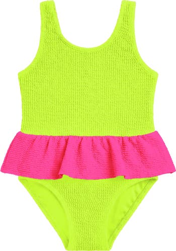 The lime Dot toddler one-piece swimsuit adds a playful touch with its timeless design and cute contrasting fuchsia ruffle peplum for a standout look. Crafted from our signature textured crinkle fabric, it ensures a soft, stretchy fit perfect for your little adventurer’s splashy fun.
