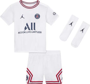 Welcome your little one to the Paris Saint-Germain fan club with this distinct Jordan Brand 2022/23 Fourth Stadium Kit set. It includes a tee, shorts and socks-all with striking Paris Saint-Germain details. Plus, integrated Dri-FIT technology wicks away sweat so your young fan can stay fresh.