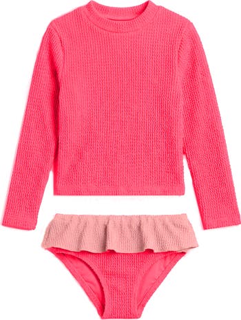 Dive into summer fun with the Pia Infant/Toddler Crinkle Ruffle Rashguard Set in vibrant fuchsia! This adorable two-piece features a solid rashguard top paired with ruffled bottoms trimmed in soft light pink. Made from our signature textured crinkle fabric, it delivers a stretchy, comfortable fit that moves with your little one's every splash and play session.