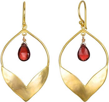 Ground yourself in the possibilities that come with transformation; release what no longer serves you and embrace your rebirth. Open-work lotus petal earrings in 18kt gold plate symbolize new beginnings and full potential. Drops of garnet, a grounding gemstone that enhances strength, love, and internal fire, dangle delicately, catching the light with each turn of the head.