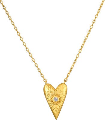 When you follow your truth, love will appear; you will discover you are infinitely loved by the Universe. A heart pendant necklace in 18kt gold plate is inscribed with a detailed flower and accented with a gleaming white topaz, stone of individuality, creativity, and awareness. On the back, a delicate inscription reads the mantra: I Am Loved. Wear this necklace to open your heart or to manifest love in abundance. A widely recognized symbol of love, the heart physically embodies our most unifying emotion and signifies charity, joy and compassion. Throughout the world, the lotus represents new beginnings, rebirth and infinite potential. In nature, the lotus roots itself in mud, arising daily from the murky water to burst into bloom.