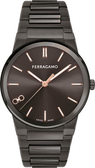 A fine sunray dial mesmerizes on this Swiss-made watch featuring a signature double-Gancio playing at eight.
