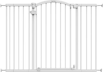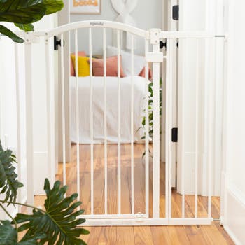 Keep your loved ones safe & secure in style with the Ingenuity Extra Tall & Wide Baby and Dog Gate. Measuring 38" tall (including a decorative arch), this white metal safety gate conveniently helps contain children and pets while complementing your home decor. A variety of included extensions help you configure the ideal setup for spaces from 29.5 to 53 inches wide. Install it in doorways or hallways quickly & easily using the included no-drill pressure mount system with adhesive wall cups that help protect your walls from damage. Or, use it at the top or bottom of stairs with included hardware (required for safe stairway installation). Recommended tools for hardware installation (not included): drill, Phillips-head screwdriver, pencil, measuring tape. NOTE: Gate will appear bent at first, rest assured that this is not a defect and will be corrected upon proper installation.