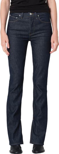 Split hems enhance the modern edginess and add a hint of flare to the slim-leg silhouette of these dark-wash jeans cut from low-stretch denim.