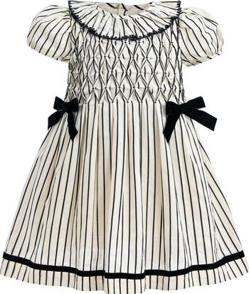 A timeless monochrome piece with vintage charm, this short-sleeved dress features crisp vertical stripes, intricate smocking, and velvet bow accents. The ruffled collar and ribbon-trimmed hem complete the elegant silhouette. Diamond-pattern smocked bodice with puff sleeves and ruffled collar. Velvet bows at the waist and black ribbon trim at the hem.