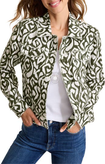 An eye-catching ikat print covers a jacket made from pure, breathable linen and edged in a bit of fun fringe.