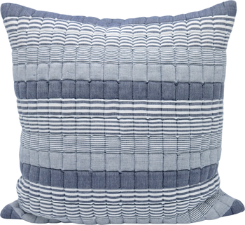 These bold blue stripes create a calm palette, perfect for layering on a sofa or adding character to a bedroom. Hand-loomed from high-quality cotton, it's as comfortable as it is stylish. There are only two families in the world who are still practicing this craft. Sujani weaving is a double-cloth technique that creates cotton-filled "puffs" with a wonderfully unique and soft texture. By selecting this handmade piece, you contribute to reviving craft and supporting artisan communities. Thank you for supporting our artisans. Material: 100% Cotton Dimensions: 20" x 20" inches