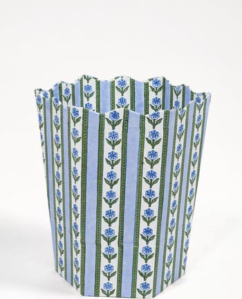 Add a splash of artistry to your home with this stunning hand-marbled scallop bin. Crafted by skilled artisans, each piece is a one-of-a-kind masterpiece, featuring swirling patterns of vibrant hues that blend seamlessly into any decor. Perfectly versatile, this bin is as functional as it is beautiful—ideal for tidying up a room as a waste bin or repurposing as stylish storage for magazines, toys, or craft supplies. The scalloped edges lend a playful touch, while the marbled finish adds an elegant touch of color to any room. A unique statement piece for those who appreciate form meeting function, this bin is collapsible so it is easy to store and put away for space efficiency. By selecting this handmade piece, you contribute to reviving craft and supporting artisan communities. Thank you for supporting our artisans. Collapsible and hand-marbled by artisans Material: Made from 100% recycled cotton paper Dimensions: 9.5"L x 9.5"W x 12.5"H inches