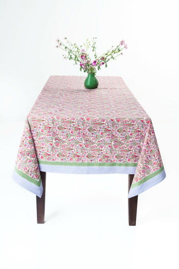 This design features a botanical delight blooming in each arch. This pattern is rooted in plant life. It is an eye-catching touch of elegant maximalism. Expertly block-printed by an eighth generation family of artisans in Jaipur, the artisans are stewards of a craft that has been passed down to them generation after generation. From the master block makers who carve the blocks in a village to the hands that print the cloth, there are many hands that go into making each piece. By selecting this handmade piece, you contribute to reviving craft and supporting artisan communities. Thank you for supporting our artisans. Material: 100% Cotton Dimensions: 60" x 90" inches 70" x 120" inches