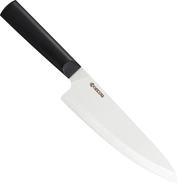 Kyocera's INNOVATIONwhite knives feature a seamless handle design with a better grip for different cutting techniques. The handle gradually thins to the blade, with a tight seam for finger grip. The circular underside of the handle and slightly thicker ends prevent the knife from dropping when hands are wet. The knives weigh half as much as their metal counterparts, making them easy to use and control, which helps improve your cutting skills in home cooking. The 7" Chefs Knife is shaped to handle any rocking-style cutting for heavy, repetitive prep tasks.