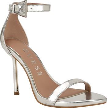 A bedazzled buckle secures the ankle strap on a glossy faux-patent sandal that's lofted by a towering stiletto.
