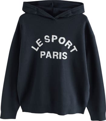 Look like a French athlete exploring America as you wander in this lightweight sweater-hoodie featuring intarsia lettering that's très sportive.