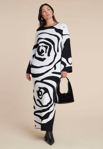 Bring graphic artistry to your look with this rosette intarsia-knit maxi dress. Flared sleeves and a close fit define the body with sleek, modern ease.