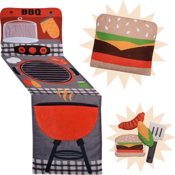 Watch your child’s creativity sizzle with this fun-filled folding Barbecue Pillow Playset. This clever decorative hamburger pillow easily unfolds into a world of make-believe creative play BBQing. Folded up into a yummy hamburger that is made in a soft microfiber material and is 14 inches by 14 inches. When fully opened the set is 14 inches by 46 inches and perfect for placing over a sofa or chair. Separate play pieces include one yummy hamburger, one juicy hot dog, one tasty ear of corn, and one spatula for moving these items around. Your little one can store any of the items in the white mesh pocket at the top of the food tray cover. The middle section features the barbecue grill surrounded by tomatoes, onion, ketchup, mustard, and salsa. The bottom section holds the barbecue in red velour and has a pocket for storing any of the play pieces. This set is machine washable except for the spatula which is spot clean only.