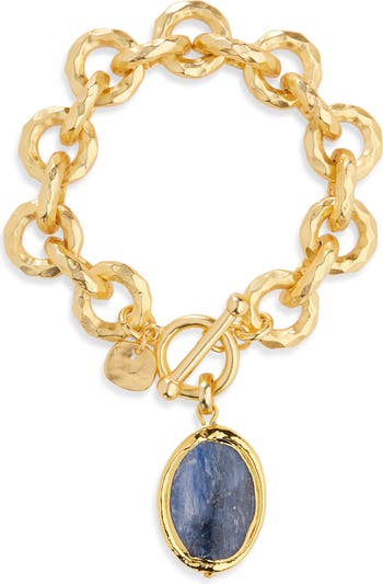 A bezel-set kyanite brings a cool flush to this warm 24-karat gold-plated bracelet. Hammered links enhance its light-catching shine.