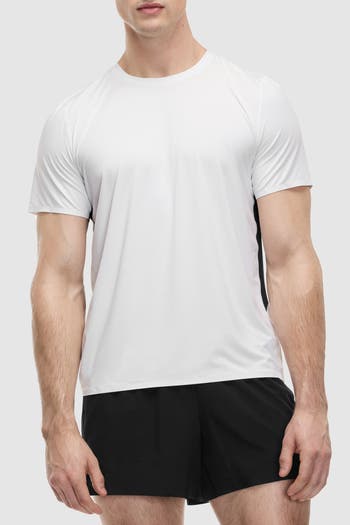 Crewneck short sleeve with set-in sleeves, colorblock stripes, ventilated mesh at center back and underarm gusset for ventilation, and bonded double hem to reduce chafe