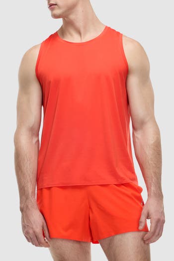 Crewneck tank top with colorblock stripe, mesh at center back for ventilation, and bonded double hem to reduce chafe
