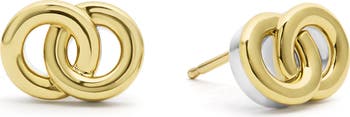 Interlocking circles made of 18-karat gold and sterling silver add warm shine to these signature stud earrings that subtly gleam at your lobes.