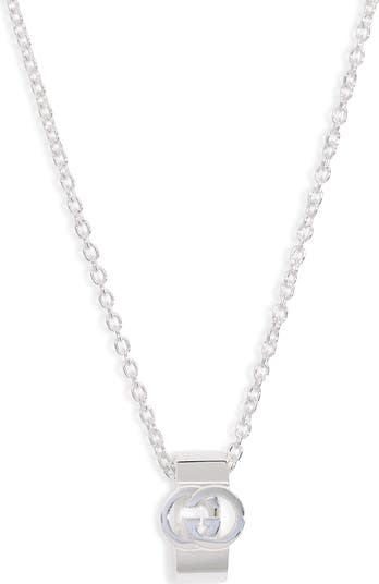 An Interlocking-G pendant is crafted from—and framed by—sterling silver and suspended from a delicate chain for an unexpectedly subtle necklace from the storied Italian design house.