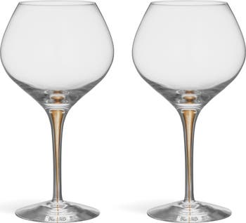 Golden pigment shimmers from the crystal-clear stems of oversized, mouthblown wine glasses that make an elegant addition to any table or home bar. Ideal for red wines, these glasses have wide bowls that allow the flavors of the wine to develop.