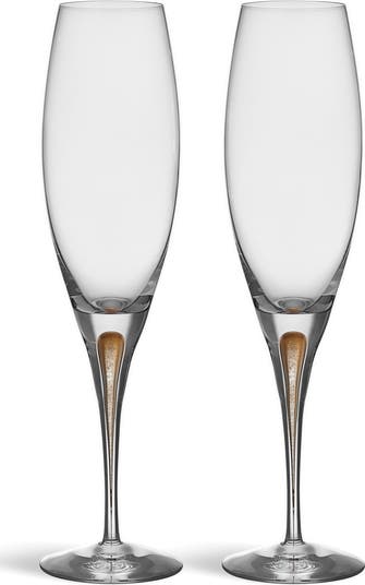 Golden pigment shimmers from the crystal-clear stems of mouthblown champagne glasses that make an elegant addition to any table or home bar. These glasses have tall, slim bowls that preserve the bubbles in sparkling beverages.