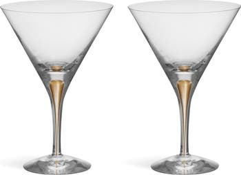 Golden pigment shimmers from the crystal-clear stems of mouthblown martini glasses that make an elegant addition to any table or home bar. These glasses are perfect for cocktails, small cold dishes and desserts.
