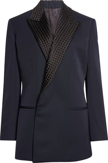 Intrecciato-weave lapels and sculptural shoulders inspired by the label's Cabat collection of bags put house-signature touches on this tailored blazer crafted from a mohair-kissed wool blend.