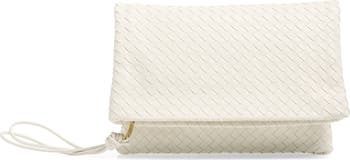 Soft lambskin leather in the brand's signature intrecciato adds pliable structure to this fold-over clutch with a knotted wrist strap.