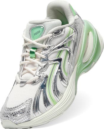 A liquid-metal cage and AI-inspired details swoop and flow with fresh energy around the mesh upper of a sneaker designed with a chunky '90s profile and a well-cushioned footbed. The plush, padded collar and grippy tread ground every step in easy-moving comfort.