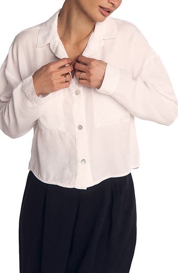 Cropped and slightly boxy, this lightweight woven shirt features an inverted pleat in back that enhances the flowy, layer-ready fit.