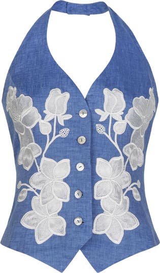 • Linen vest featuring pearl buttons and embroidered flowers