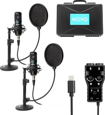 Host studio quality podcasts in no time with the Movo Smartphone Podcast Recording Bundle! This ultimate kit for podcasters and streamers has all the equipment you'll need to record crystal clear audio for two speakers. The two condenser microphones feature shock mounts, internal pop filters, and cardioid polar patterns, ideal for rooms with multiple speakers. A dual-channel Lightning interface makes recording from your iOS device a snap. Also includes a pair of adjustable metal mic stands and flexible external pop filters. Perfect for podcasts, livestreaming, let’s plays, interviews, and more. Set comes with a free one-year warranty and friendly customer service based in the U.S.A.