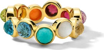 Bezel-set round stones in rainbow hues circle around this statement-making band crafted from 18-karat gold.