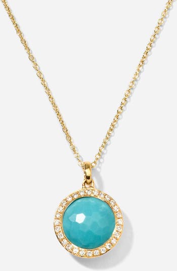 A classic pendant necklace set in 18-karat gold boasts a frame of 28 sparkling diamonds that surround a hand-faceted semiprecious stone.