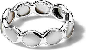 Lustrous oval-shaped mother-of-pearl housed in sterling silver compose a beautiful band that will be a timeless addition to your accessory collection.