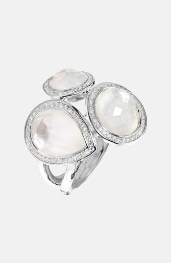 Asymmetrical facets lend signature brilliance and dimension to a multi-stone setting accented with diamonds atop a hammered, forked ring band.