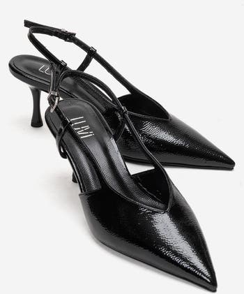 A modern open-back pointed-toe pump with a sleek patent finish and minimalist T-strap and adjustable back strap