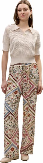 Capture effortless elegance in this silky pant, featuring a captivating montage floral print in ivory tones inspired by vintage silk scarves. The fluid silhouette is enhanced by a comfortable elastic waistband and full lining, creating a luxurious drape that moves gracefully with every step.