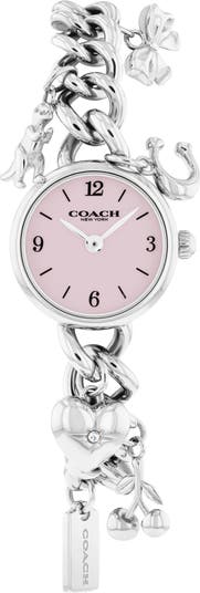 The brand's iconic typeface brings both readability and instant recognition to this diminutive watch set on a slender link bracelet charmed with other brand icons.