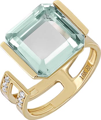 Part of our online trunk show, this style is available for a limited time from November 10 through December 23. Shimmer both day and night with this handcrafted ring featuring a polished open band with six bezel-set diamonds and a sparkling, cushion-cut green-prasiolite setting.