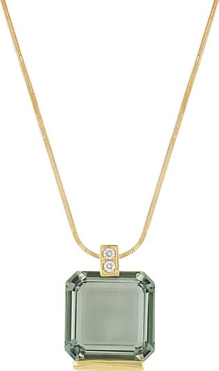 Part of our online trunk show, this style is available for a limited time from November 10 through December 23. Shimmer both day and night with this handcrafted necklace featuring a polished snake chain, diamond-embellished bail and sparkling, cushion-cut prasiolite pendant.