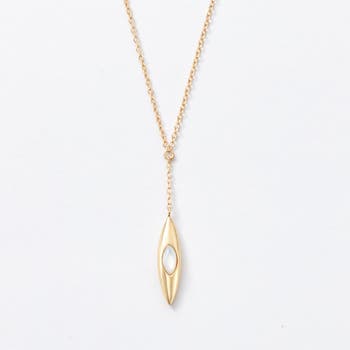 Inspired by the quiet elegance of a blooming iris, this sculptural pendant brings a sense of calm and beauty to your everyday. Designed with playful movement in mind, it has two distinct sides; one side features a mother of pearl, the other a white topaz. Pendant dances and flips between sides when worn.