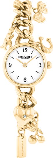 The brand's iconic typeface brings both readability and instant recognition to this diminutive watch set on a slender link bracelet charmed with other brand icons.