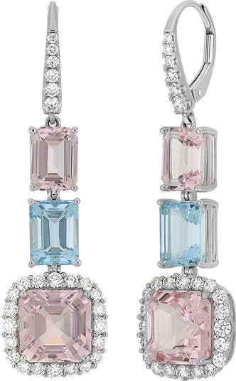These gorgeous handcrafted drops that dance and catch the light with every tilt of the head feature an aquamarine stone between two morganite stones and a total of 52 diamonds.