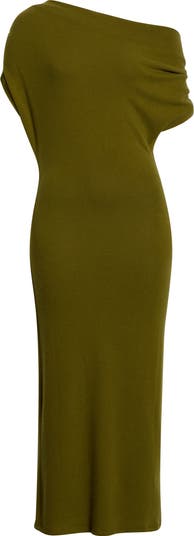 A soft, organic-cotton-enriched knit gives this ruched dress the comfort of a casual favorite, while the asymmetric neckline that dips off one shoulder and curve-hugging fit imbue it with night-out seduction.
