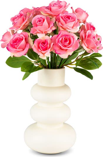 Graceful and refined, the Iris RealTouch Rose Arrangement features luxurious, vibrant pink RealTouch roses, exuding a sense of timeless beauty. Set in a beautifully sculptural white vase, its elegant design adds a touch of sophistication to any space. This striking arrangement offers a perfect balance of vibrant color and understated elegance, elevating your décor with effortless charm. A lasting luxury, timeless and unrivaled.