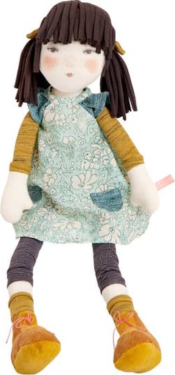 The beautiful Rosalies collection is designed to play but will also fit perfectly in an enchanted decor. Iris is a large sized rag doll with a soft face delicately illustrated and printed, with brown hair in rolled jersey set in pony tails. She wears a light blue dress with a floral pattern and ruffles on the shoulders. Ready to play outdoor with her pair of brown laced boots.