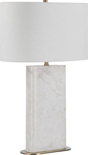 Brushed antiqued-brass accents the sturdy marble base of this lamp topped with a wide drum shade that softly illuminates any space you add it to.